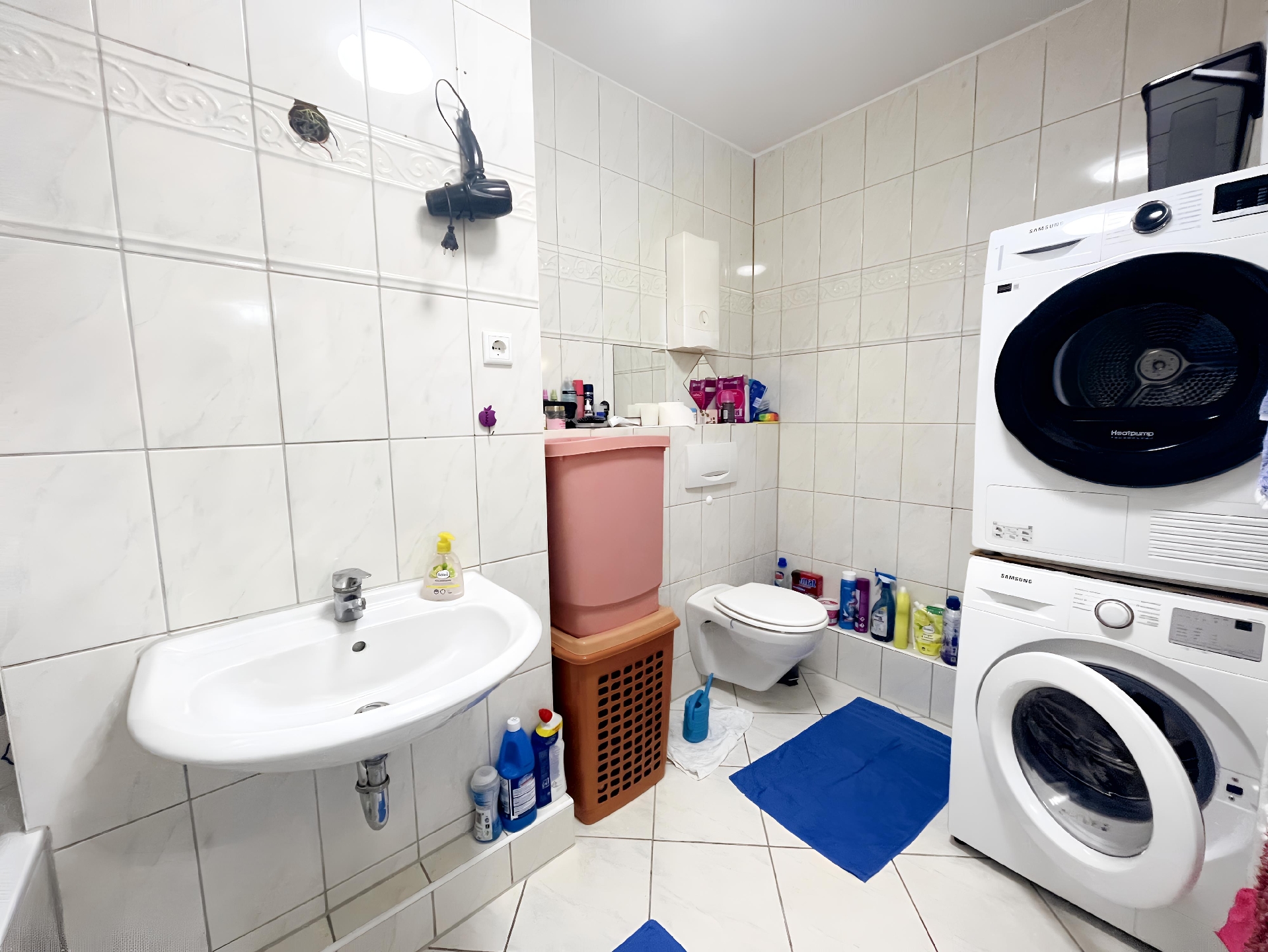 Das Badezimmer ist mit einer Badewanne ausgestattet und verfügt zusätzlich über einen praktischen Waschmaschinenanschluss. Die Küche bietet ausreichend Stell- und Arbeitsfläche und kann nach individuellen Vorstellungen modernisiert werden.