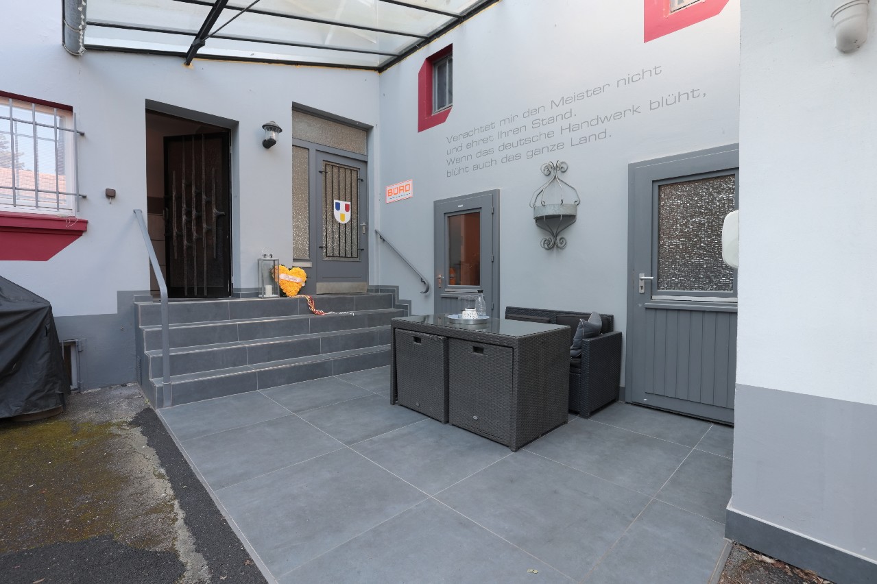 Im Hochparterre befindet sich eine abgeschlossene Büroeinheit mit drei Räumen, Empfangstheke, Gäste-WC und Küche. Ideal für Kundenempfang, Verwaltung oder Planung. Die angrenzenden Lagerflächen im hinteren Bereich und in den Nebengebäuden ermöglichen eine klare funktionale Trennung zwischen Büro und Werkstatt.