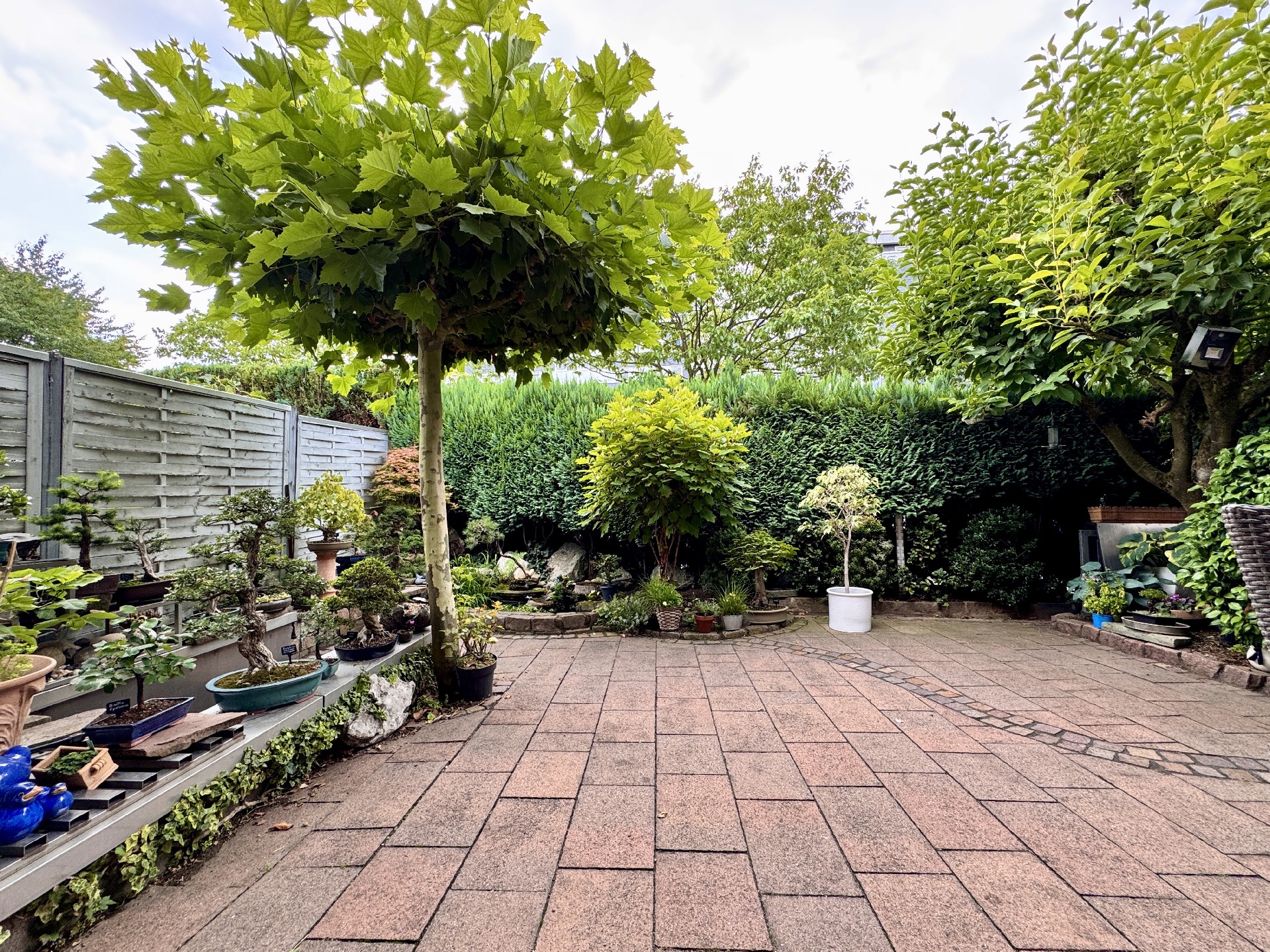 Pflegeleichter Garten größtenteils gepflastert, mit umlaufender Begrünung als grüner Rückzugsort