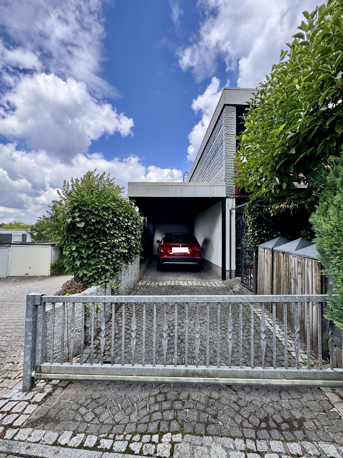 Garage direkt am Haus, mit zusätzlich vorgelagertem Carport sowie einem Schiebetor zur Einfahrt