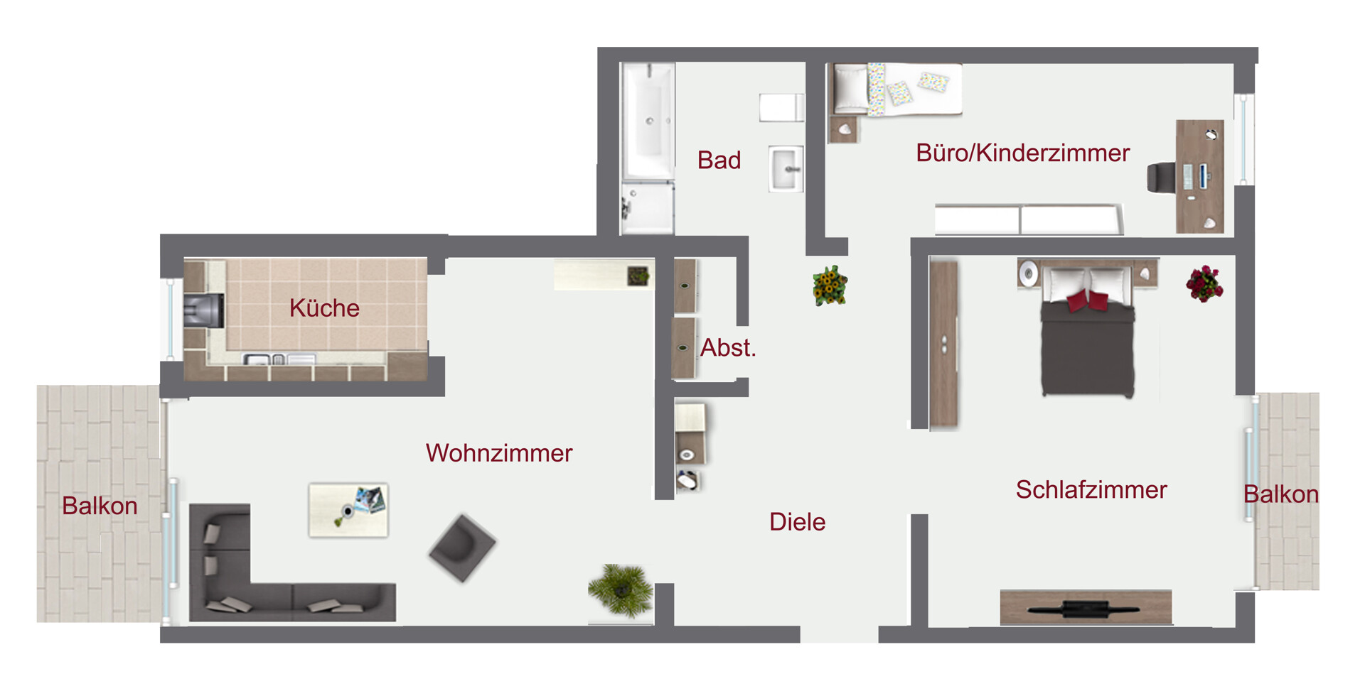 Das Schlafzimmer bietet viel Platz und verfügt über den zweiten Balkon, der für angenehmes Morgenlicht sorgt. Das zusätzliche Büro-/Kinderzimmer eignet sich flexibel als Arbeits-, Gäste- oder Kinderzimmer. Ein Abstellraum innerhalb der Wohnung sorgt für weiteren Stauraum im Alltag.