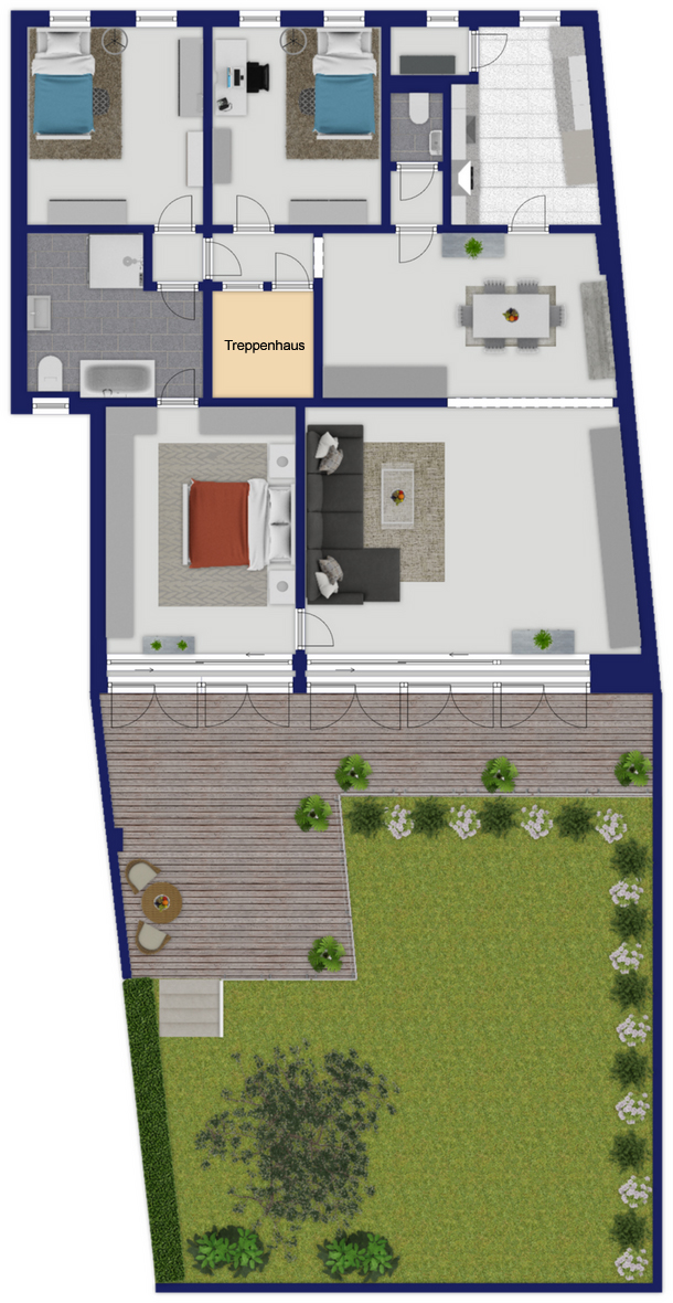 Insgesamt bietet diese Wohnung eine gelungene Kombination aus großzügigem Wohnen, funktionaler Raumaufteilung und attraktiven Außenflächen.