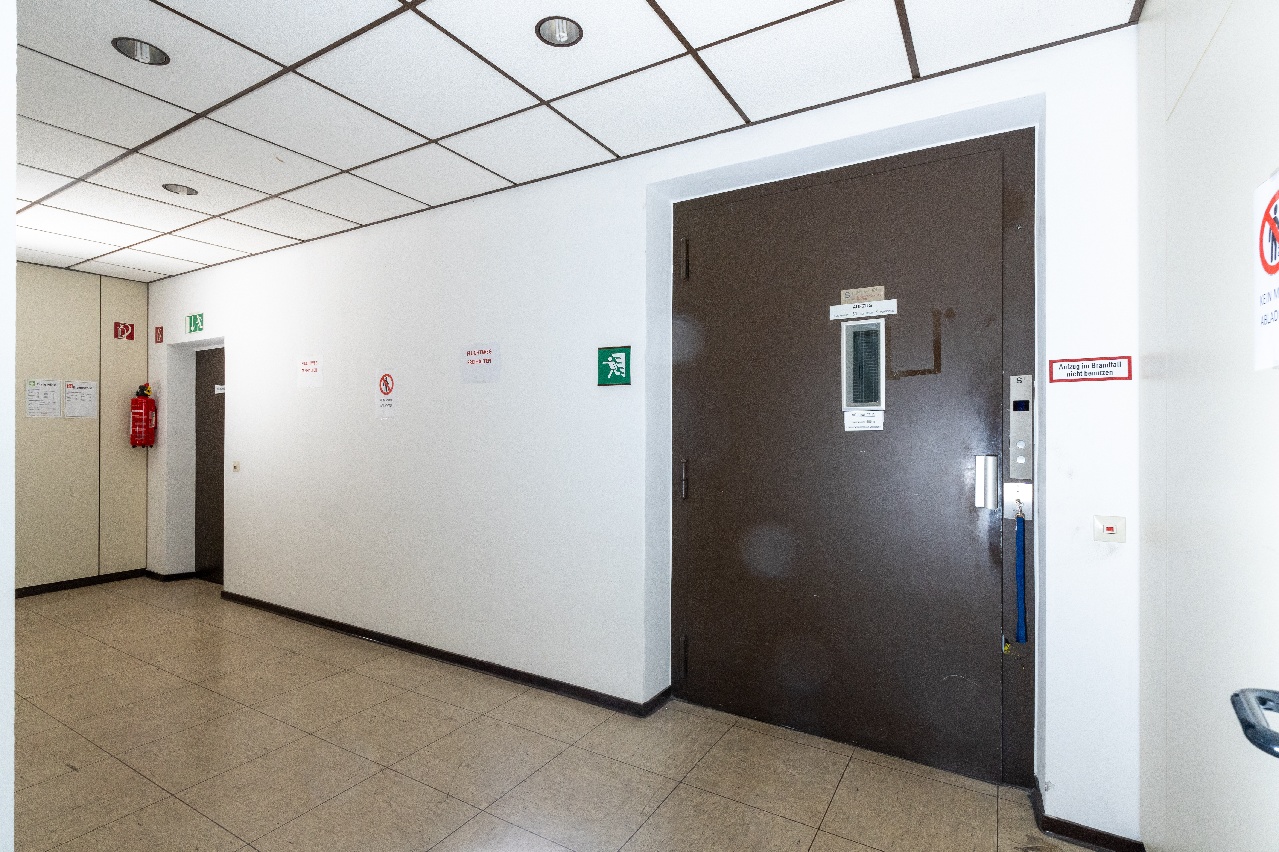 Barrierefreiheit: Ein Personenaufzug mit zusätzlicher Zugangsmöglichkeit zur rechten Büroetage im 1. OG.
