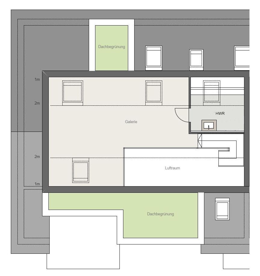 Über eine moderne Treppe erreichen Sie den großen, stilvollen Galerie-raum in der 2. Wohnebene. Ein zusätzlich auf dieser Ebene untergebrachter Hauswirtschafsraum mit Waschbecken, Stellplatz für Waschmaschine und Trockner und extra viel Stauraum erspart Ihnen auf Wunsch den Weg in den Waschkeller.
