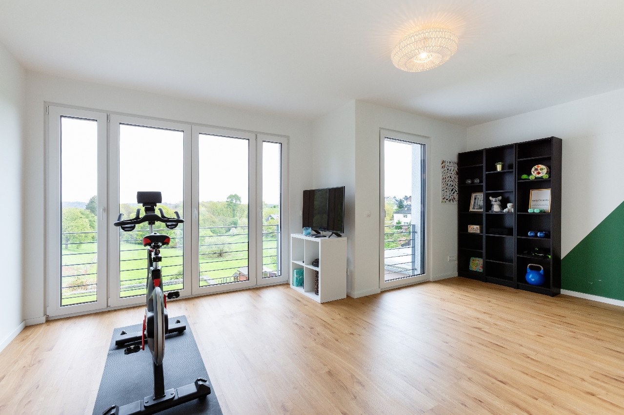Das Dachgeschoss ist ein echtes Refugium: Das Schlafzimmer mit Zugang zur Dachterrasse lädt dazu ein, morgens mit Blick ins Grüne und den ersten Sonnenstrahlen aufzuwachen, den Blick durch die großen Fenster ins Grüne schweifen lassen und sich sofort geborgen zu fühlen. Das große Duschbad bietet Luxus und Komfort, während der Waschraum mit Waschmaschine und Trockner praktische Unterstützung im Alltag bietet. Das Ankleide- bzw. Gästezimmer im Dachgeschoss macht diese Wohnebene noch vielseitiger und einladender.
