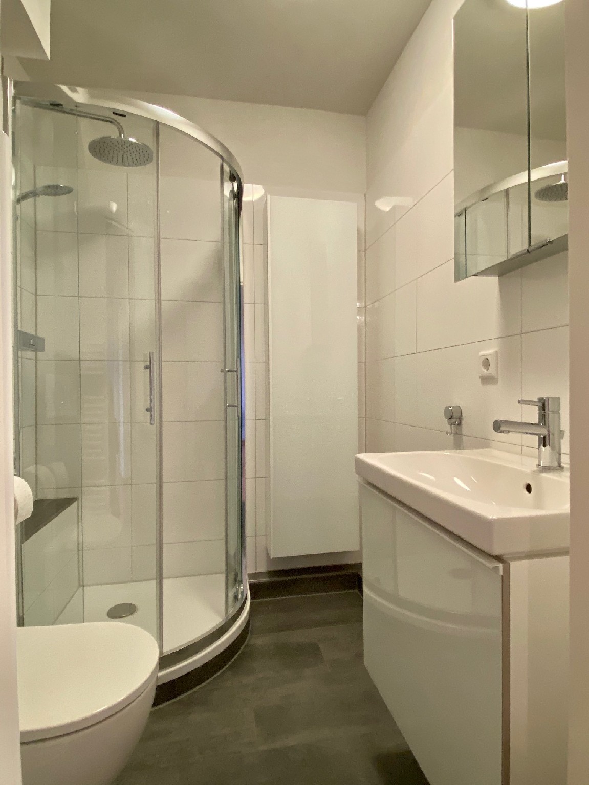 Das hell geflieste Duschbad mit zeitgemäßen Badmöbeln strahlt Frische und Komfort aus und bietet Ihnen einen stilvollen Rückzugsort für Ihre tägliche Auszeit.
