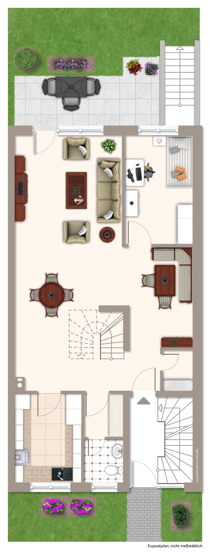 Willkommen in Ihrem neuen Zuhause einer großzügigen 3-Zimmer-Wohnung, die mit 99 m² Wohnfläche viel Raum für Ihre individuellen Gestaltungsideen bietet. Diese charmante Wohnung erstreckt sich über das Erdgeschoss und Obergeschoss eines gepflegten Reihenmittelhauses, welches im Jahr 1979 erbaut wurde. Betreten Sie die Wohnung und lassen Sie sich von der hellen und freundlichen Atmosphäre verzaubern. Die großzügigen Zimmer bieten Ihnen viel Platz, um Ihre Wohnträume zu verwirklichen. Ob gemütliches Wohnzimmer, stilvolle Schlafzimmer oder ein gemütliches Kinderzimmer hier finden Sie die perfekte Balance zwischen Funktionalität und Komfort. Ein besonderes Highlight ist die einladende Terrasse, die Ihnen die Möglichkeit bietet, entspannte Stunden im Freien zu genießen. Stellen Sie sich vor, wie Sie an warmen Sommerabenden mit Freunden grillen oder einfach nur die Sonne auf Ihrer eigenen kleinen Oase genießen. Zusätzlich zur Wohnfläche stehen Ihnen ein Keller und eine Garage zur Verfügung, die Ihnen ausreichend Stauraum für Ihre persönlichen Dinge bieten. Die Wohnung wartet darauf, von Ihnen mit Leben gefüllt zu werden. Nutzen Sie die Chance, Ihren individuellen Stil und Ihre persönlichen Akzente in diesem Raum zu verwirklichen. Diese Wohnung ist ideal für all jene, die das Leben in einer ruhigen, aber dennoch zentralen Lage schätzen. Lassen Sie Ihrer Kreativität freien Lauf und gestalten Sie Ihr neues Zuhause nach Ihren Wünschen!