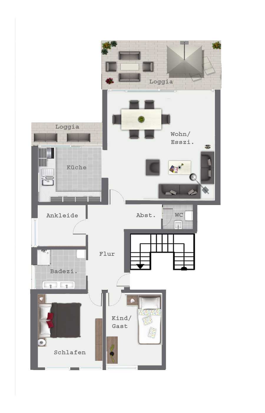Die gesamte Wohnung ist mit hochwertigen, großformatigen Fliesenböden in moderner Betonoptik ausgestattet und vermittelt ein stilvolles, zeitgemäßes Wohngefühl.