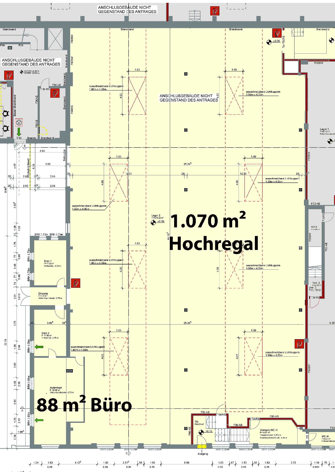 • Das Objekt wird heute als Lager und Büro genutzt. Die Lagerfläche verfügt über eine Höhe von 5,30 – 6,00 Metern und kann sowohl als Lager- als auch als Produktionsfläche genutzt werden. Zugänglich ist diese Fläche über zwei Rolltore, sowie über die Lagerverwaltung. Diese verfügt über einen eigenen Eingang und erstreckt sich über ca. 88 m² moderne Bürofläche. Hier gibt es zwei Einzelbüros, sowie ein Großraumbüro. Diese sind ebenfalls sehr modern und hell gestaltet und verfügen über heutige Technikstandards.