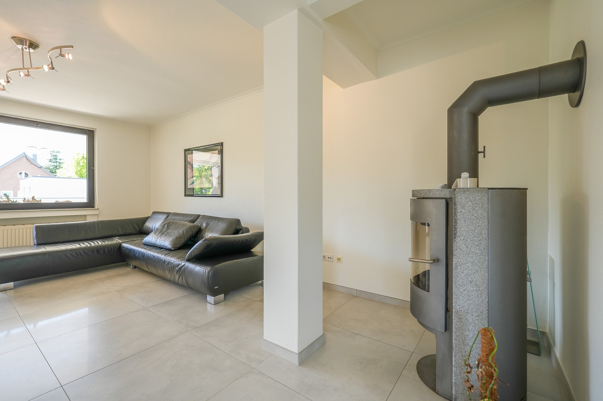 Offener Wohn- und Essbereich mit gemütlichem Kamin – der Mittelpunkt des Hauses
