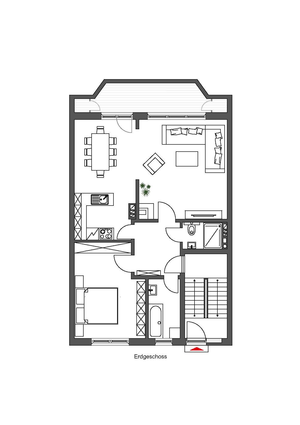 Erdgeschosswohnung (ca. 72 m²): großzügige 2-Zimmer-Wohnung mit funktionalem Grundriss.