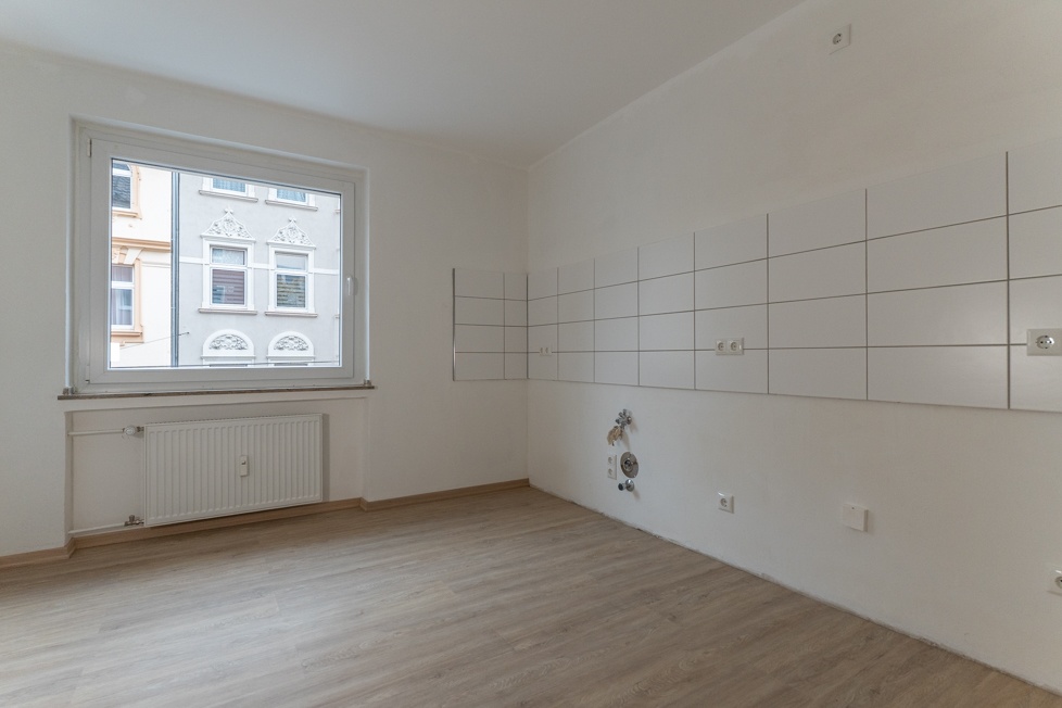 Rechts daneben befindet sich die Küche, die Raum für eine Küchenzeile und einen kleinen Essbereich bietet.