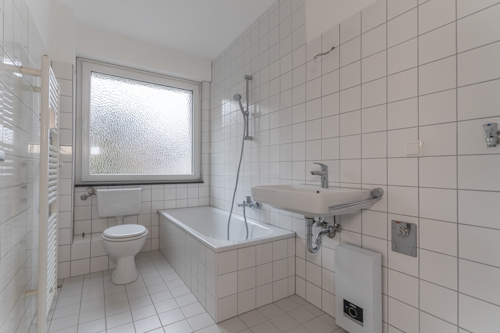 Badezimmer: Tageslichtbad, modern gefliest mit Badewanne und beheiztem Handtuchhalter, Spiegelschrank