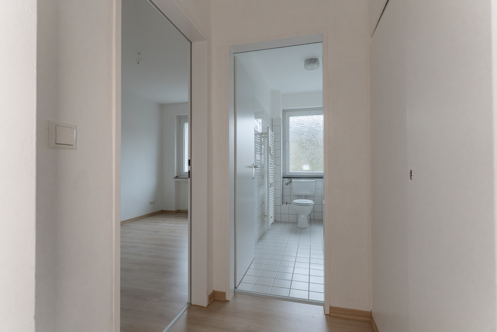 Von hier aus führt gleich links ein Zwischenflur zu einem Arbeits-/ oder Schlafzimmer mit Blick in den ruhigen Innenhof sowie zum hell gefliestem Tageslichtbad mit Badewanne, Handtuchheizkörper und Waschmaschinenanschluss. Ein praktischer Einbauschrank im Zwischenflur bietet zusätzlichen Stauraum.