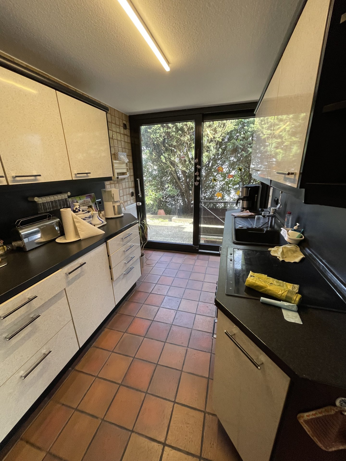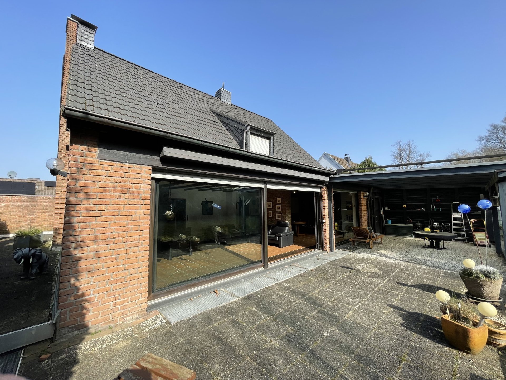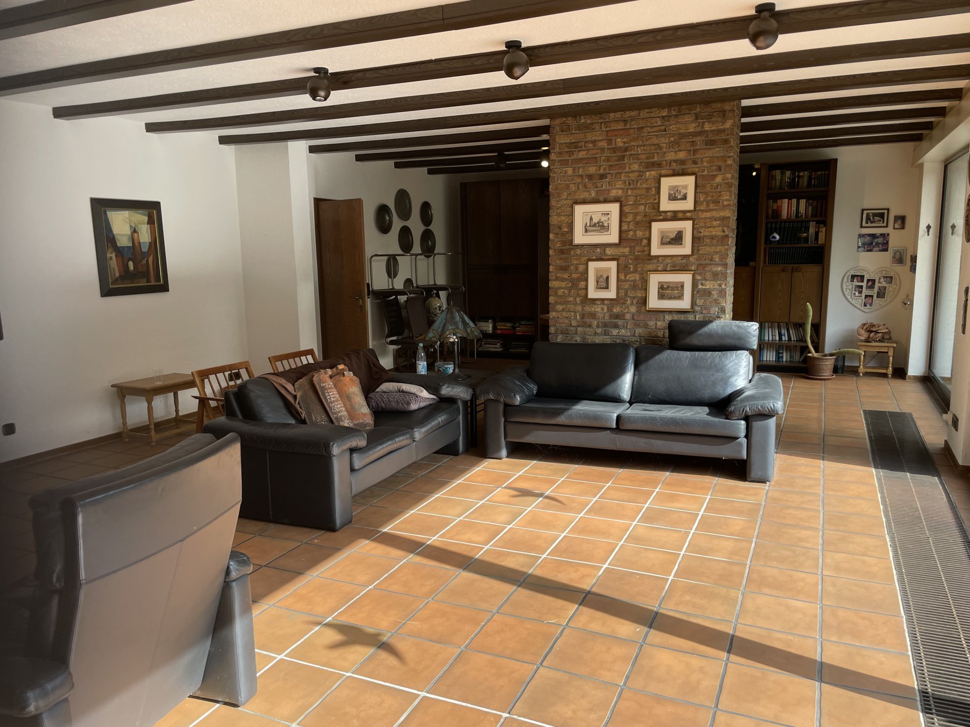 • Eine Treppenanlage führt Sie von der Straße aus auf die Eingangsebene. Im Dielenbereich befindet sich klassisch ein Gäste-WC sowie die Garderobe. Wenn wir die Räume im Uhrzeigersinn betrachten, gelangen wir zuerst in den praktischen Hauswirtschaftsraum. Hier kann bequem die Wäsche gewaschen und auch Vorräte gelagert werden. Daneben liegt die Küche, die einen Zugang zu einer der drei Terrassen (Morgensonne) bietet. Dann folgt der sehr große Wohn-Essbereich, der im Zuge der Renovierungsarbeiten in 1980 großzügig erweitert wurde. Hier können Sie sich möbeltechnisch austoben. Für wohlige Wärme in den Übergangszeiten steht im Wohnzimmer ein gemütlicher Kamin bereit. Über ein großes Fenster-Schiebelement erreichen Sie den nach Süden ausgerichteten Garten. Entlang der Fensterfront erstreckt sich die 2. sehr große Terrasse. Für Schlechtwettertage wurde ein Großteil der Terrasse überdacht. Die dritte Terrasse befindet sich an der Westseite des Hauses und ermöglicht Ihnen schöne Abendstunden bei einem leckeren Glas Wein.