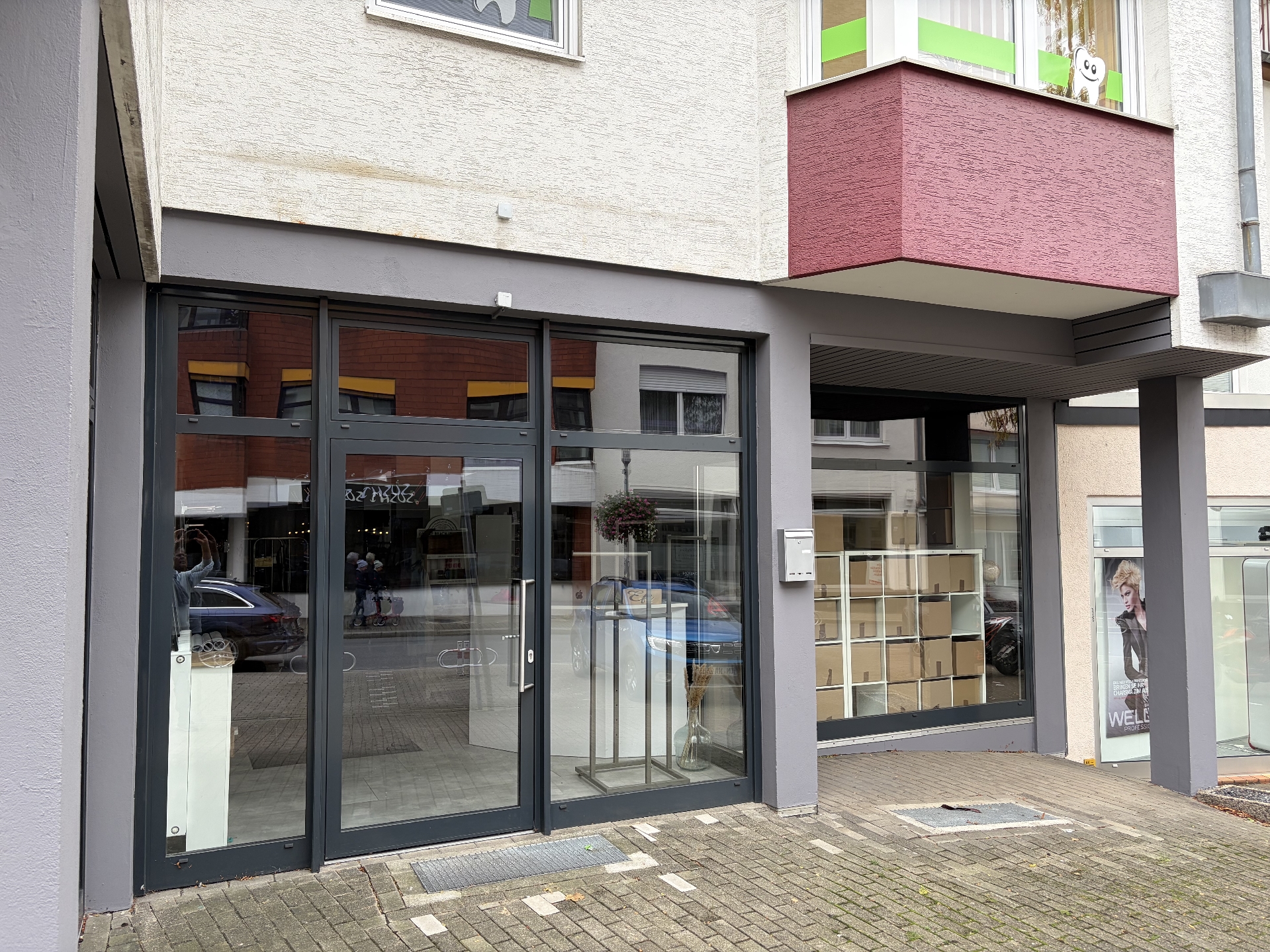 Insgesamt handelt es sich um ein Wohn-/Geschäftshaus mit Arztpraxen, Wohnungen und 2 Ladenlokalen. Das linke wird durch eine Hausverwaltung genutzt und dies soll ebenso als Büro / Verkaufsfläche (keine Gastronomie, Friseur, Lebensmittel o.ä.) vermietet werden.
