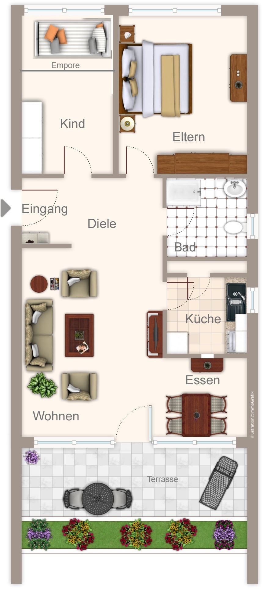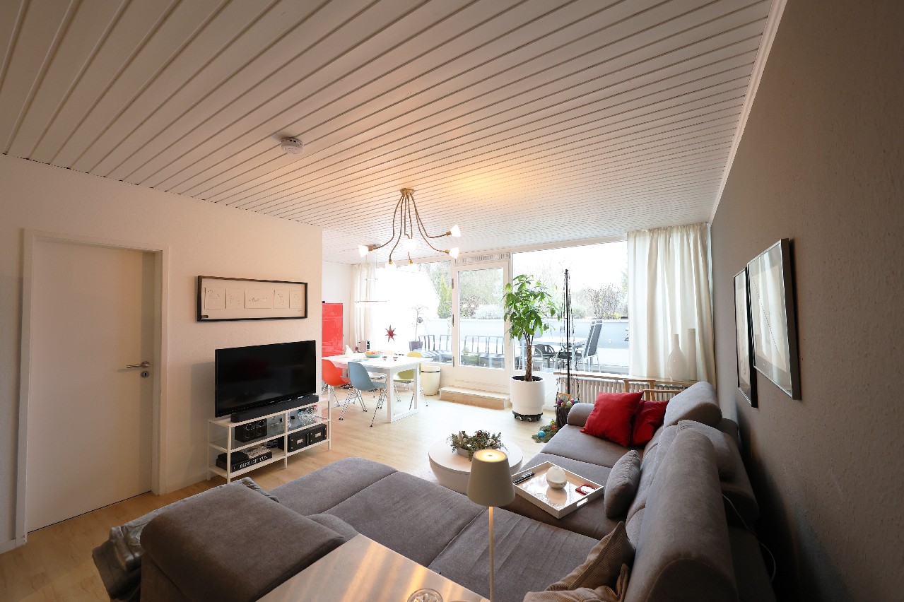 Große bodentiefe Fensterflächen vor der Terrasse lassen den dort angrenzenden Wohnraum in schönem Licht erstrahlen und bringen zusätzliche Gemütlichkeit in die Wohnung.