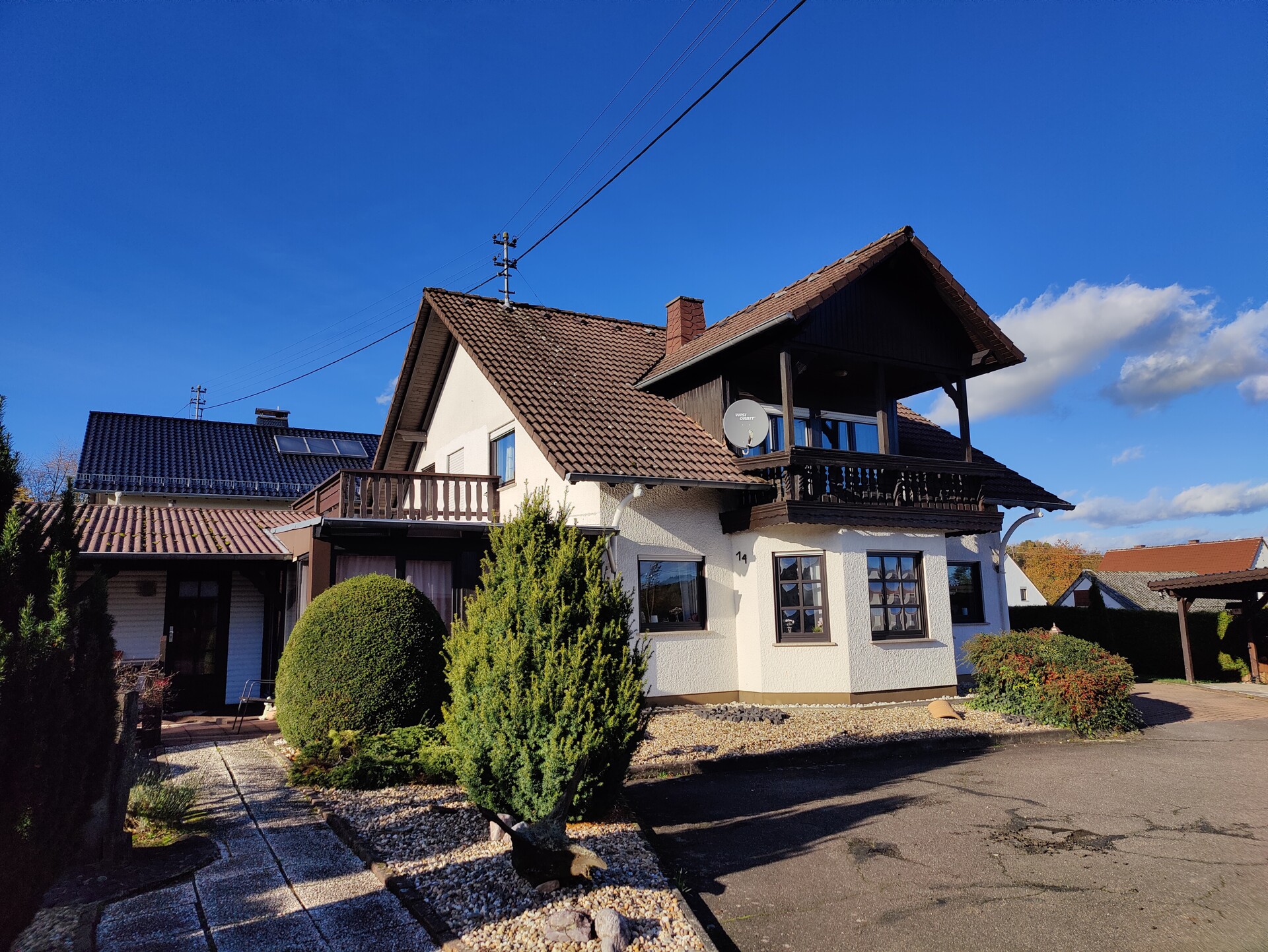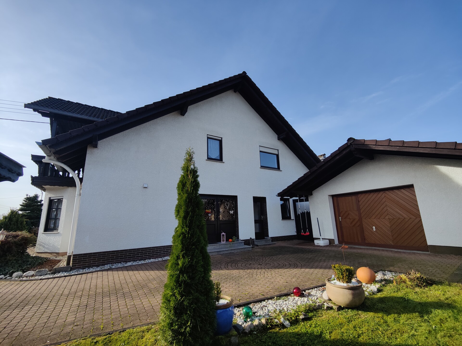 Über eine gemeinsame Zufahrt mit dem Nachbarhaus gelangt man zum Haupthaus sowie zu den beiden Garagen. -