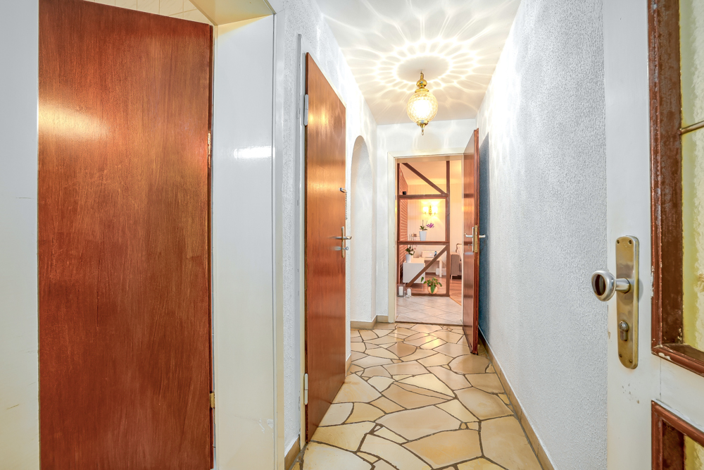 Im Obergeschoss befindet sich ein großes Schlafzimmer mit direktem Zugang zu einem weiteren Balkon. Ein kleineres Zimmer, derzeit als Küche genutzt, kann flexibel umgestaltet werden. Zwei weitere Zimmer sowie ein vollwertiges Badezimmer komplettieren diese Ebene.Das Untergeschoss bietet vielseitige Möglichkeiten und ergänzt die Wohnfläche um praktische und flexibel nutzbare Räume. Über einen separaten Eingang erreichbar, stehen hier zwei großzügige Hobbyräume und ein Badezimmer mit einer Gesamtfläche von 35 m² zur Verfügung. Auch Küchenanschlüsse sind gegeben. Diese Räume eignen sich ideal als Werkstatt, Fitnessraum, Lagerfläche oder für kreative Hobbys. Aktuell ist dieser Bereich nicht zu Wohnzwecken genehmigt, weshalb sich die 121,28 m² Wohnfläche lediglich auf das Erd- und Obergeschoss beziehen.
