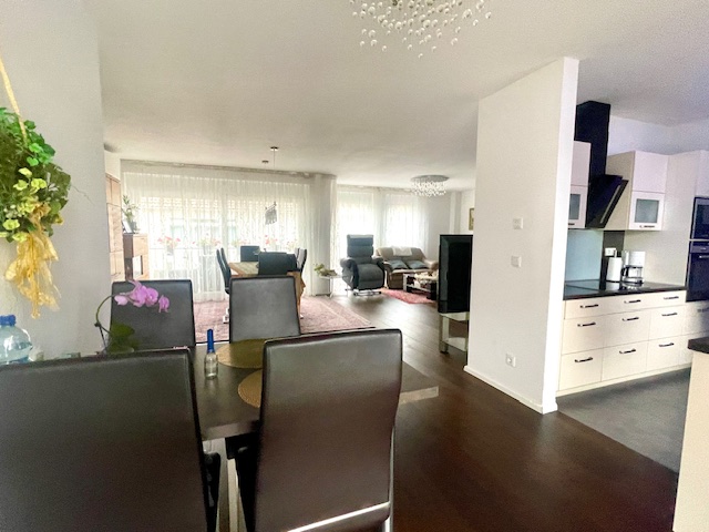 Der lichtdurchflutete Wohn- und Essbereich mit integrierter Küche (mit Einbau) bildet das Herzstück der Wohnung – perfekt für gesellige Abende oder entspannte Stunden im Familienkreis.